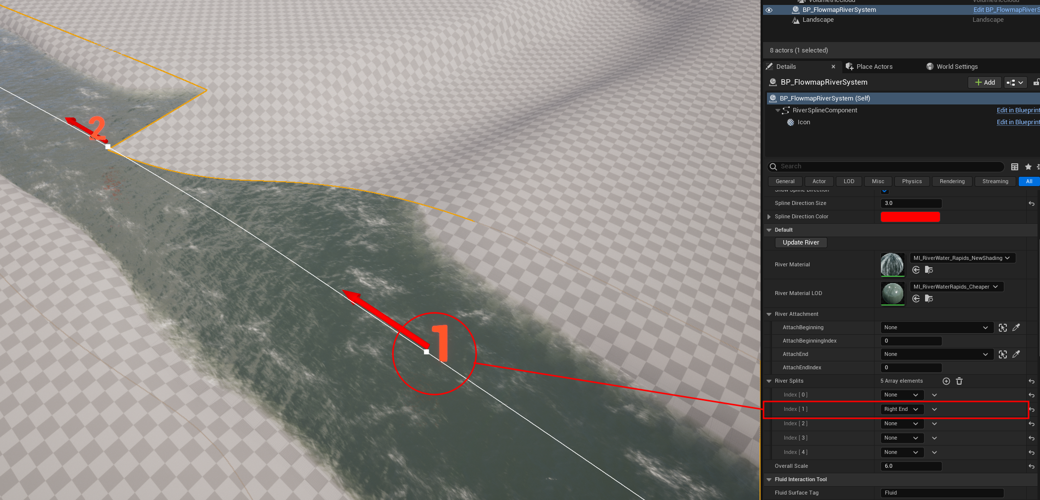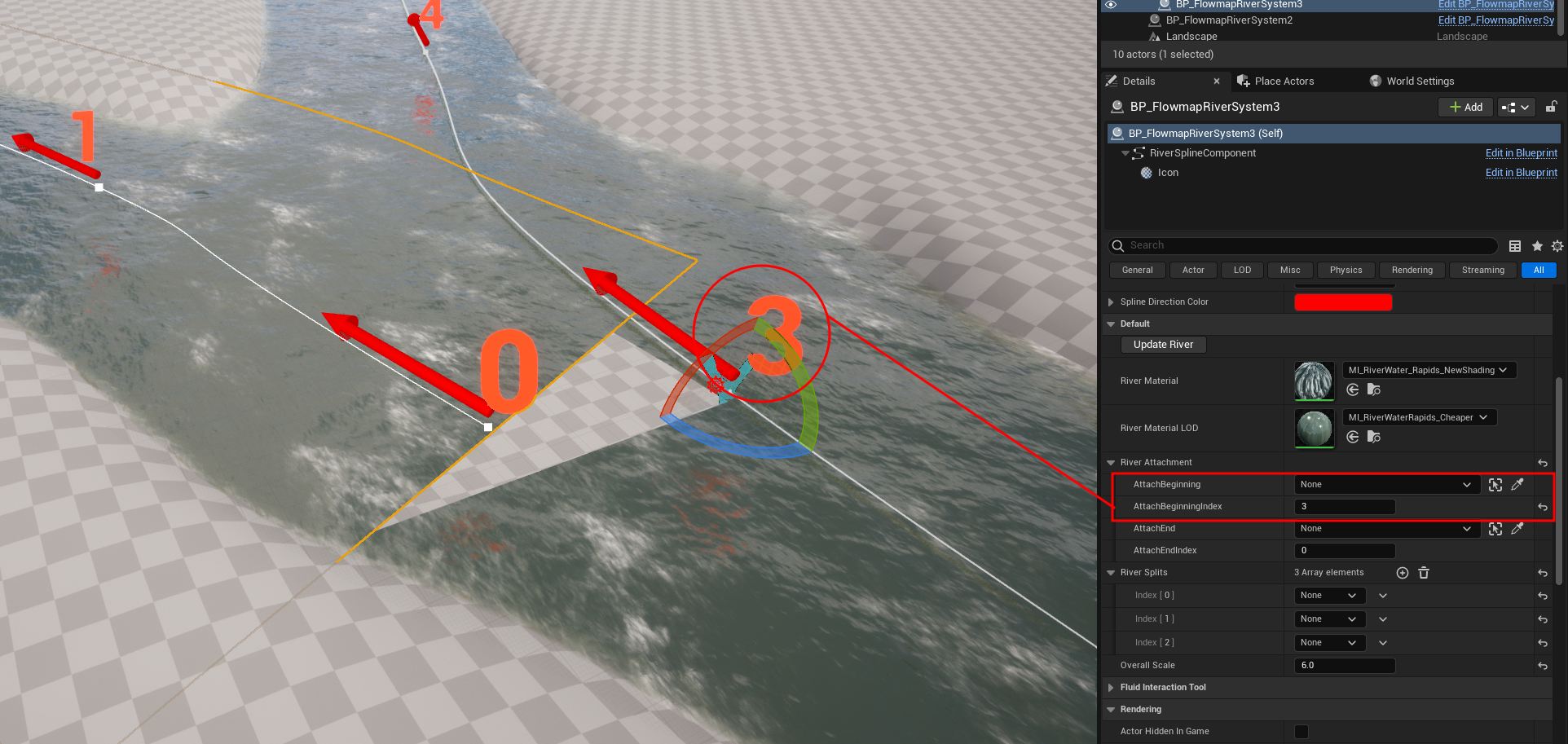 We then set the `AttachBeginning` and `AttachBeginningIndex` to the main river and Spline Point `(3)`.