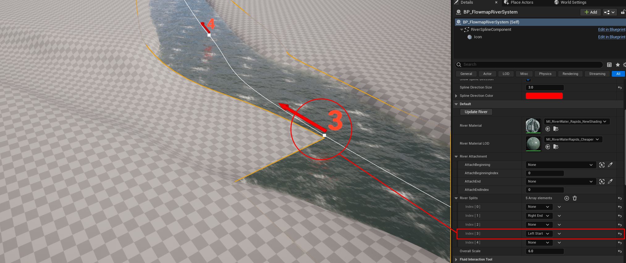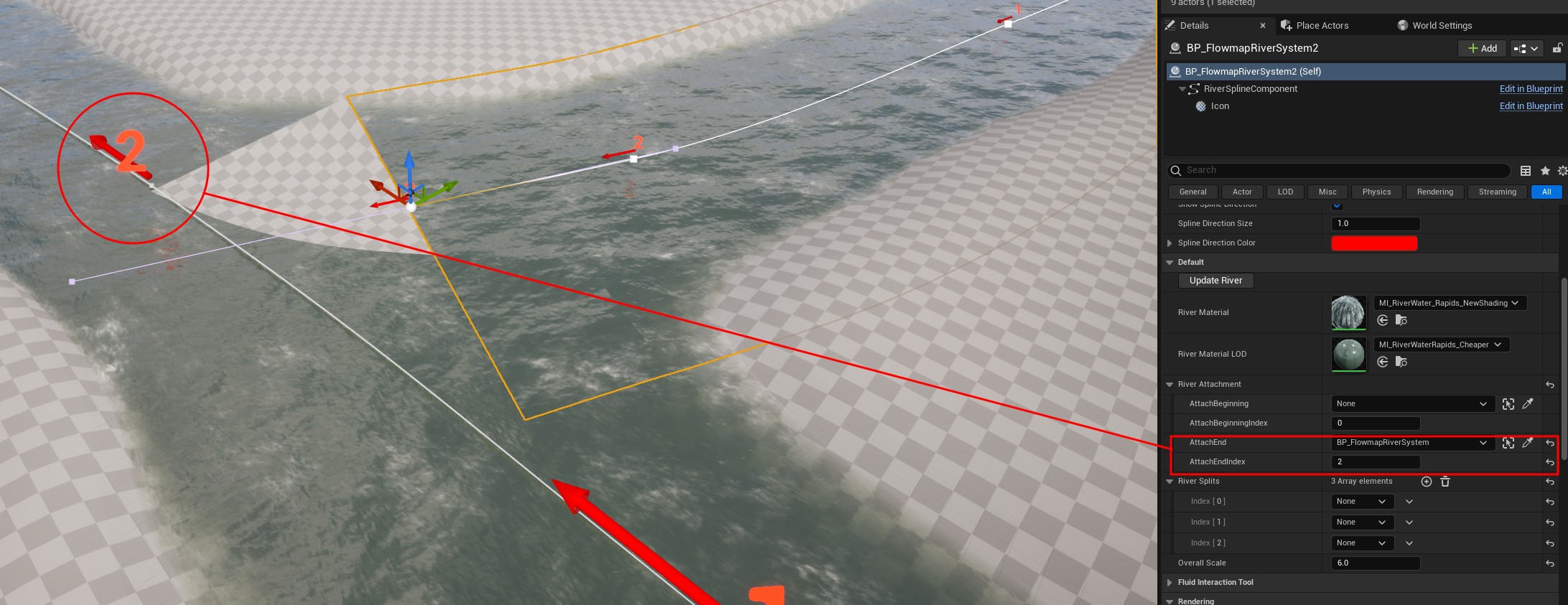 Within the *Details Panel* of the newly placed river, navigate to the `AttachEnd` input. Select the original river for this input, and then under the `AttachEndIndex` set this to the visually split river Spline Number.
