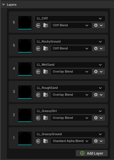 Layers are laid out like the Layer Palette in Photoshop or similar programs, showing them in order from top to bottom to eaisly visualise the order. Click Add Layer to add a new Layer to this Material.