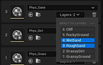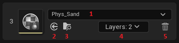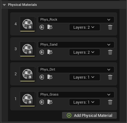 While Physical Materials are laid out like Layers, their order doesn't actually matter as they are applied to Layers through the Layers Dropdown. Click Add Physical Material to add a new Physical Material to this Material.